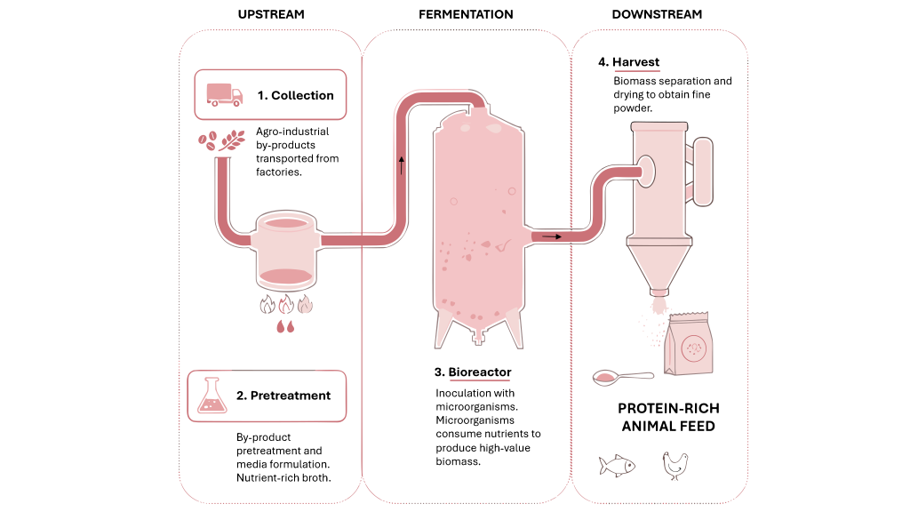 BioProcesia ofrece un proceso alternativo que desliga la producción de proteína del consumo de recursos naturales limitados. El material de partida para este bioproceso son los residuos generados en la industria agroalimentaria, que mediante la fermentación microbiana son revalorizados y pueden volver a entrar en la cadena de valor agroalimentaria como ingredientes naturales y sostenibles para alimentación animal.